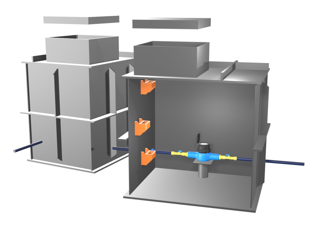 Vodomerné šachty slúžia na umiestnenie vodomeru. Štandardne sú vybavené nášľapmi, 2x prestupom pre vodovodné potrubie PE DN32mm a plastovým stolíkom pod vodomer. Na vybudovanie prípojky vodovodného radu u nehnuteľnosti sa najskôr odporúčame vopred informovať u správcu vodovodov a kanalizácií, ktorý Vám odporučí vhodný typ plastovej vodomernej šachty, do ktorej je možné vodomer osadiť. Štandardné sú plastové vodomerné šachty vo variante samonosnej, ktorá je určená iba pre obsyp zeminou. Pri nároku na pojazdovosť vodomernej šachty alebo iné vyššie statické zaťaženie je nutné vodomernú šachtu dodatočne obetónovať.